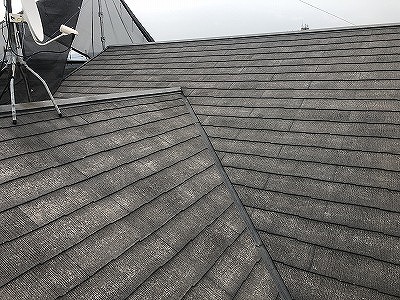 屋根表面には、長年の雨風によって付着したコケ・カビ・汚れ・古い塗膜の粉(チョーキング)が蓄積しています。