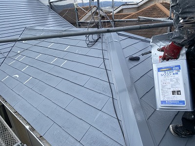 屋根材の小口部分からまずは塗装隙間を埋めないようにしっかり塗布!