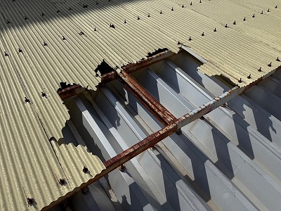 写真のように波板の一部が割れて穴が開き、屋根下地の鉄骨部分が見えている状態になっています。