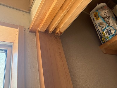 和室の雨漏り箇所の柱や木枠部分にシミや変色が見られる場合、すでに内部まで雨水が侵入している状態ですね!