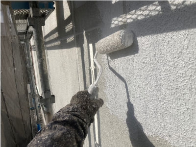 下塗り塗料を塗布していきます。パーフェクトフィラーは、微弾性(ひび割れ追従性)