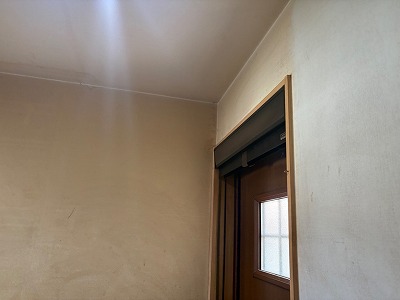 今回の現場では、玄関内のクロス(壁紙)が本来の白色から茶色に変色している状態を確認しました。