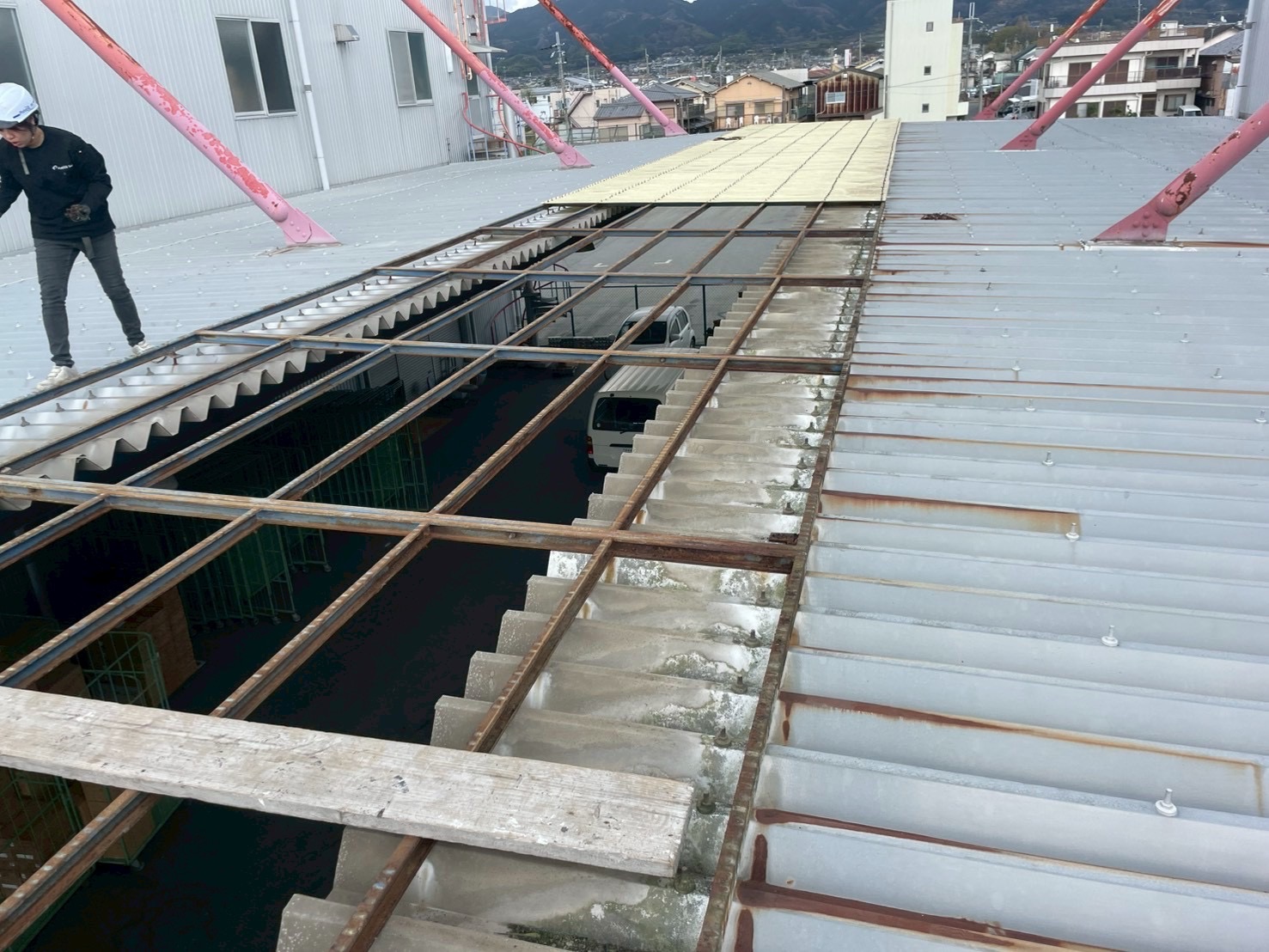 波板撤去の際歩み板をうまく利用して、波板を撤去していきます。