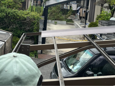 現場を確認すると、年数が経って劣化した 塩ビ波板が割れ・変形し、釘の抜けも多い状態 でした。このままでは風で飛ばされる危険性が高く、お車や周囲への被害も心配される状況でした。