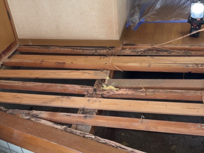 その結果、下地の「根太(ねだ)」がシロアリによって激しく浸食されていることが判明しました