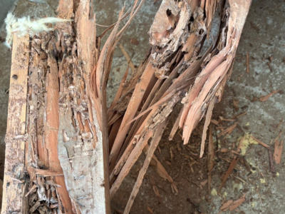 シロアリの食害により、木材が内部まで深く浸食されており、手で触れるだけでも崩れてしまうほど脆くなっています。