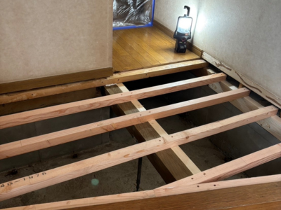 今回は根太部分がだべられてた事もあり!完全に強度を失っていました。根太は床の踏み場になるので重要な構造材です。