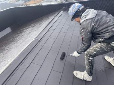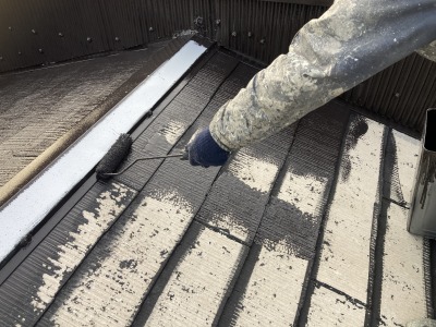 ローラーで丁寧に塗り重ねることで、屋根材の凹凸部分までしっかり塗料を行き渡らせます。