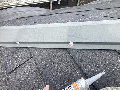 今回は他社が以前屋根材を釘で固定せずに、コーキング一カ所に止めている状態でした。