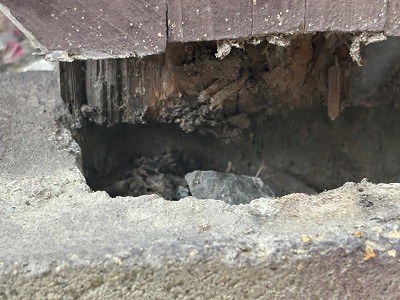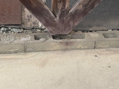 現地調査を行ったところ、木柱の根元が浮き、土間コンクリートとの間に隙間が発生している状態でした。