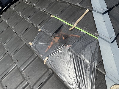 今回の現場では、割れている瓦の範囲をしっかり確認!防水性のあるビニールシートで覆い