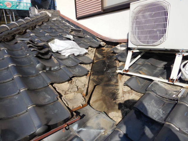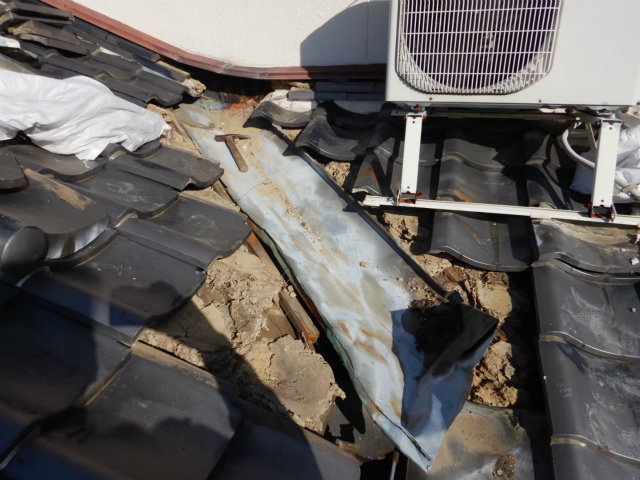 現地調査を行ったところ、瓦屋根の谷板金(たにばんきん)旧鉄板が穴が空いている状態で雨漏りしている状態でした。