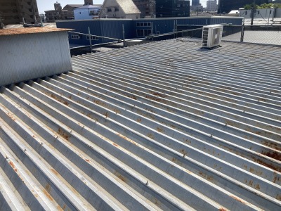 折板屋根のケレン作業で、表面の浮きサビや剥がれた塗膜をできる限り除去した後、